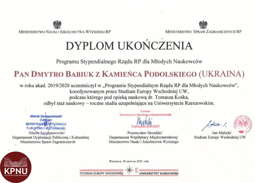 Рішенням конкурсної комісії Центру Східноєвропейських студій Варшавського університету аспірант кафедри всесвітньої історії Дмитро Бабюк (науковий керівник Сергій Копилов, доктор історичних наук, професор, ректор) проходив десятимісячне наукове стажування в одному з наших партнерських ЗВО – Жешувському університеті (https://www.ur.edu.pl/). Воно відбувалося в межах стипендіальної програми уряду Республіки Польща для молодих науковців. Дмитро Бабюк розповідає про своє стажування та ділиться враженнями.