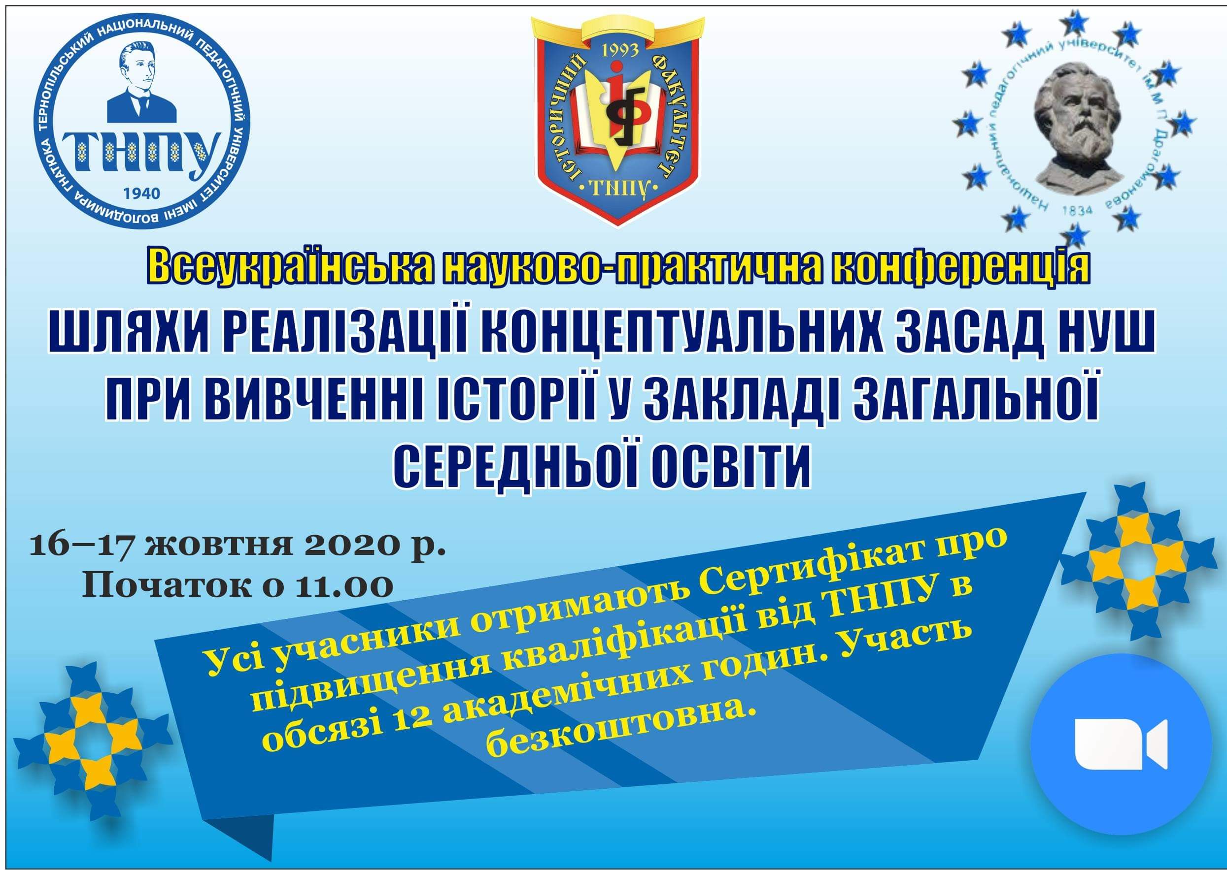 16 жовтня 2020 р. кафедра всесвітньої історії та релігієзнавства історичного факультету Тернопільського національного педагогічного університету імені Володимира Гнатюка провела всеукраїнську науково-практичну конференцію «ШЛЯХИ РЕАЛІЗАЦІЇ КОНЦЕПТУАЛЬНИХ ЗАСАД НОВОЇ УКРАЇНСЬКОЇ ШКОЛИ ПРИ ВИВЧЕННІ ІСТОРІЇ У ЗАКЛАДІ ЗАГАЛЬНОЇ СЕРЕДНЬОЇ ОСВІТИ».