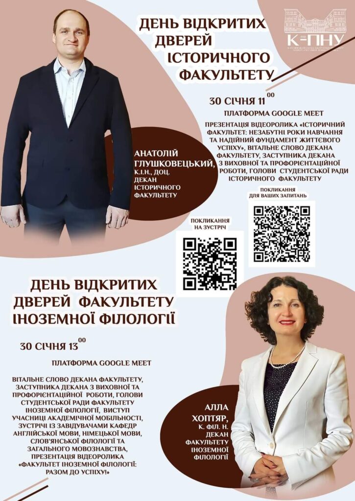 Ми продовжуємо цикл зустрічей “Дні відкритих дверей онлайн”. 30 січня відбудуться ДНІ ВІДКРИТИХ ДВЕРЕЙ історичного факультету (11:00) і факультету іноземної філології (13:00). Під час онлайн-зустрічей ви матимете змогу поспілкуватися з керівництвом факультетів, завідувачами кафедр, представниками студентського самоврядування.