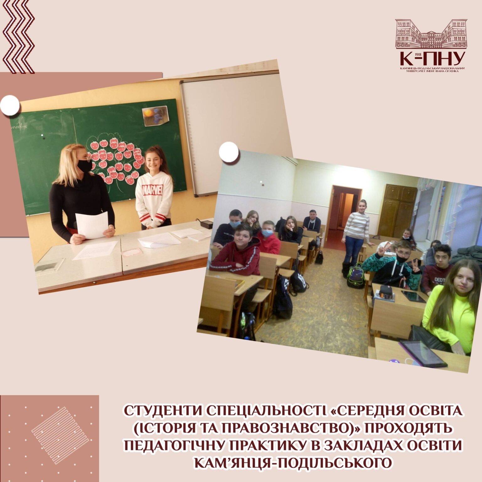 Педагогічна практика є важливим складником у системі професійної підготовки вчителя. Формування критичного мислення, набуття професійно важливих якостей, усвідомлення себе в ролі майбутнього педагога є поштовхом до самовдосконалення, розвитку здібностей, удосконалення умінь, необхідних для майбутньої педагогічної діяльності. Студенти 4 курсу денної форми навчання історичного факультету спеціальності «Середня освіта (Історія та правознавство)» поділилися своїми враженнями про проходження виробничої педагогічної практики в закладах освіти Кам’янця-Подільського.