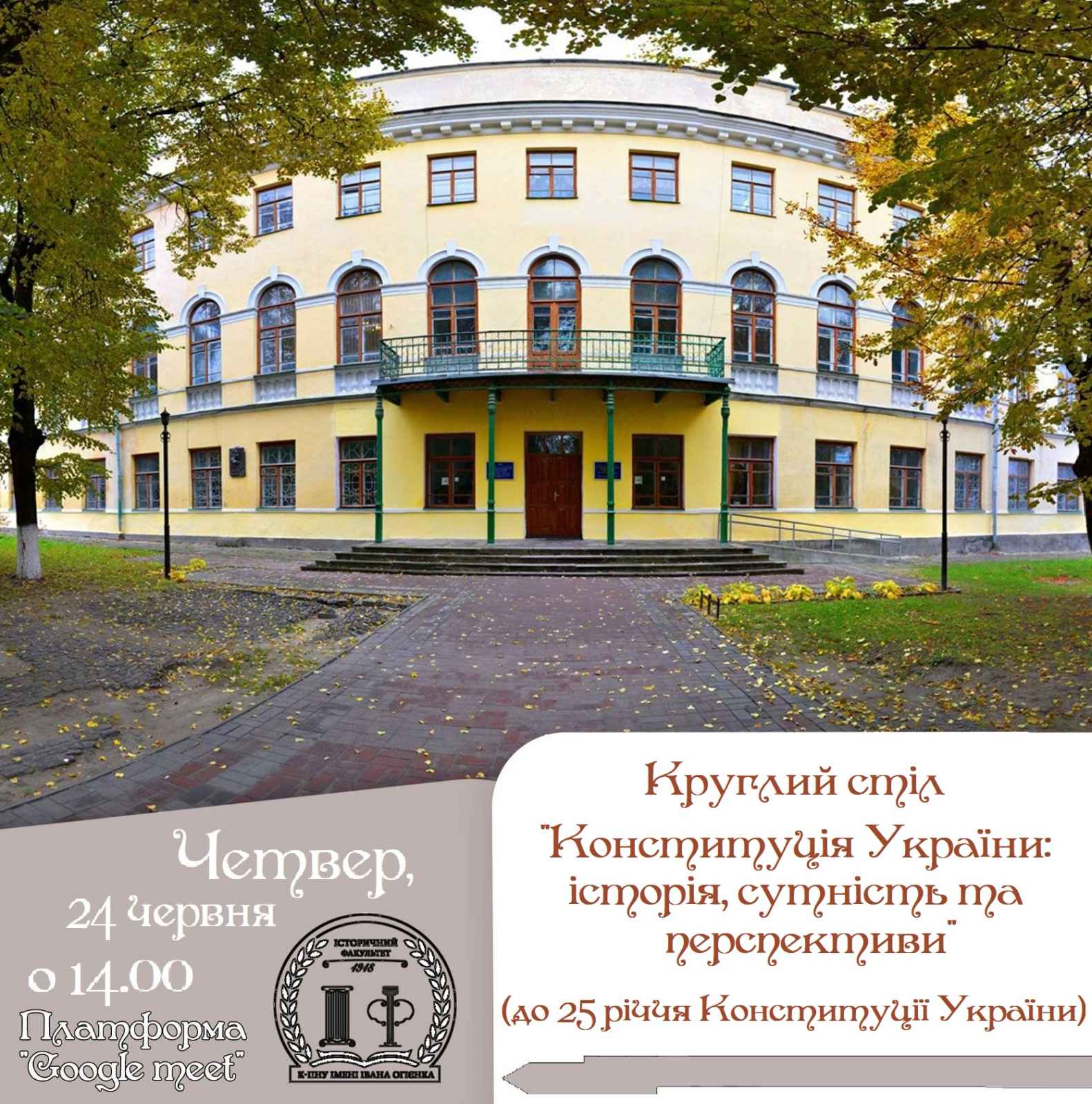 24 червня о 14.00 на платформі Google Meet відбудеться круглий стіл “Конституція України: історія, сутність та перспективи”.