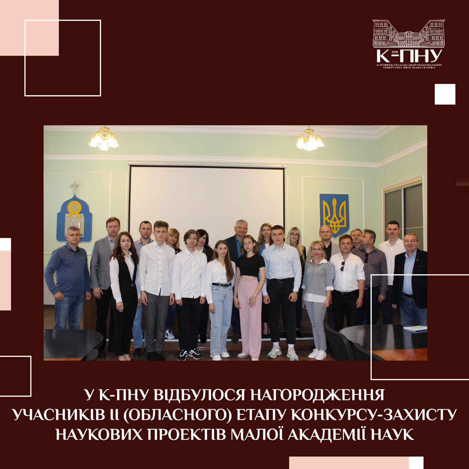 24 травня в К-ПНУ відбулося нагородження учасників ІІ (обласного) етапу конкурсу-захисту наукових проектів Малої академії наук, за результатами якого опубліковано 8-ий випуск збірника наукових матеріалів «Наукові студії учнів-старшокласників». Конкурс відбувається в межах співпраці Кам’янець-Подільського національного університету імені Івана Огієнка з управлінням освіти і науки Кам’янець-Подільської міської ради та Центром професійного розвитку педагогічних працівників Кам’янець-Подільської міської ради.