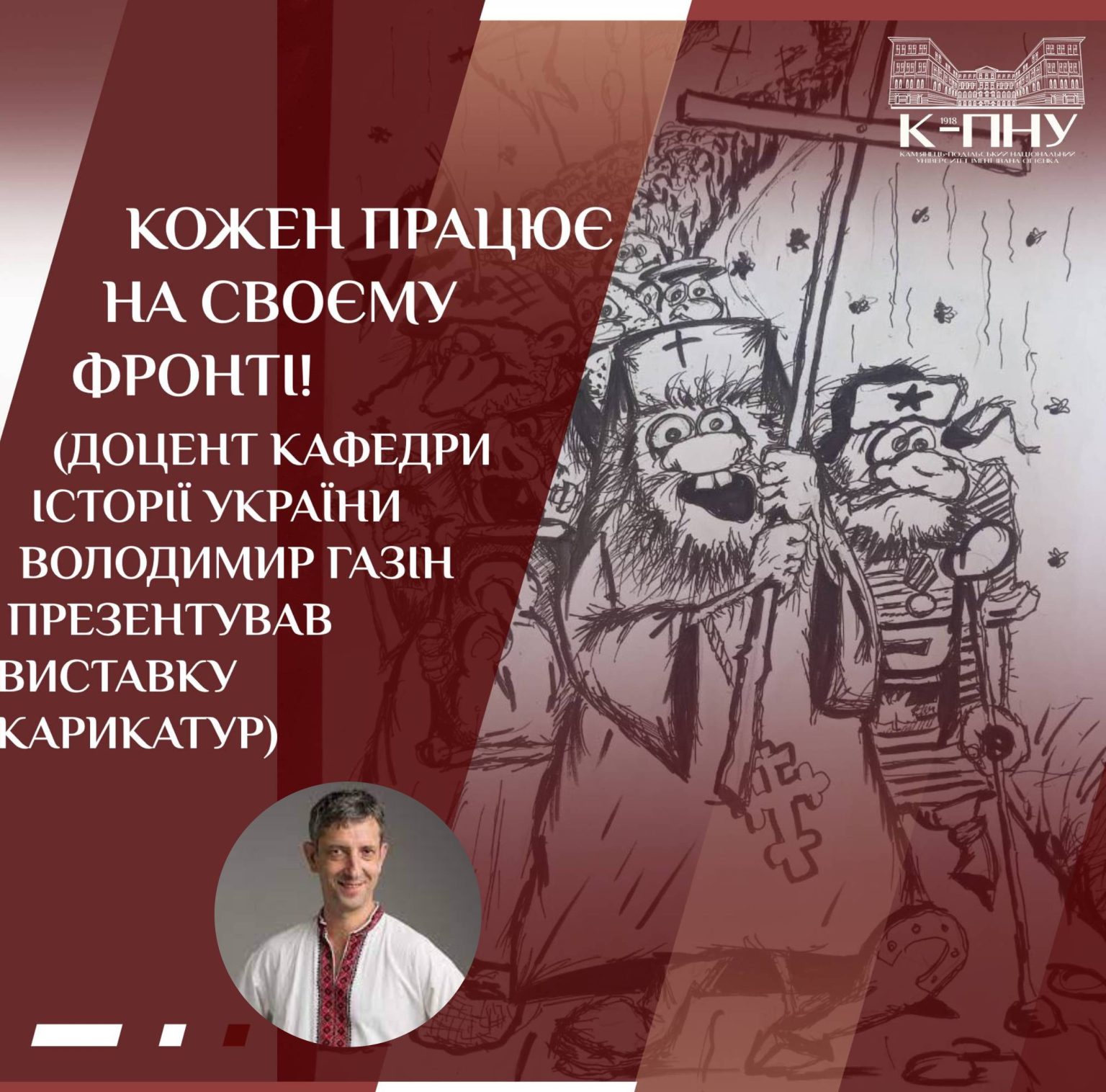 Доктор історичних наук, доцент кафедри історії України Володимир Газін здавна захоплюється цікавим жанром образотворчого мистецтва – карикатурою. Розвинуте почуття гумору і визначило таке захоплення (поза науковою та педагогічною діяльністю). Сьогодні карикатурні замальовки Володимира Володимировича презентовані у Виставковій залі в Кам’янці-Подільському.