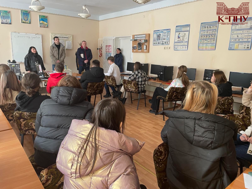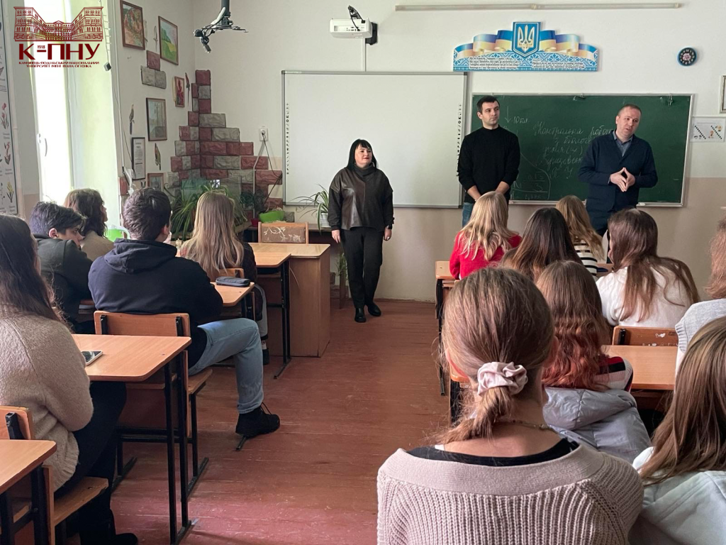 До учнів випускних класів шкіл м. Борщів, Іванківської загальноосвітньої школи І-ІІІ ступенів і Скала-Подільського навчально-виховного комплексу «Загальноосвітній навчальний заклад І-ІІІ ступенів – дошкільний навчальний заклад» завітали Наталія Гудима, кандидат філологічних наук, доцент, керівник навчально-методичного відділу К-ПНУ, Владислав Гарбар, кандидат географічних наук, старший викладач кафедри географії та методики її викладання і Вадим Маркітантов, кандидат політичних наук, доцент кафедри політології та філософії.