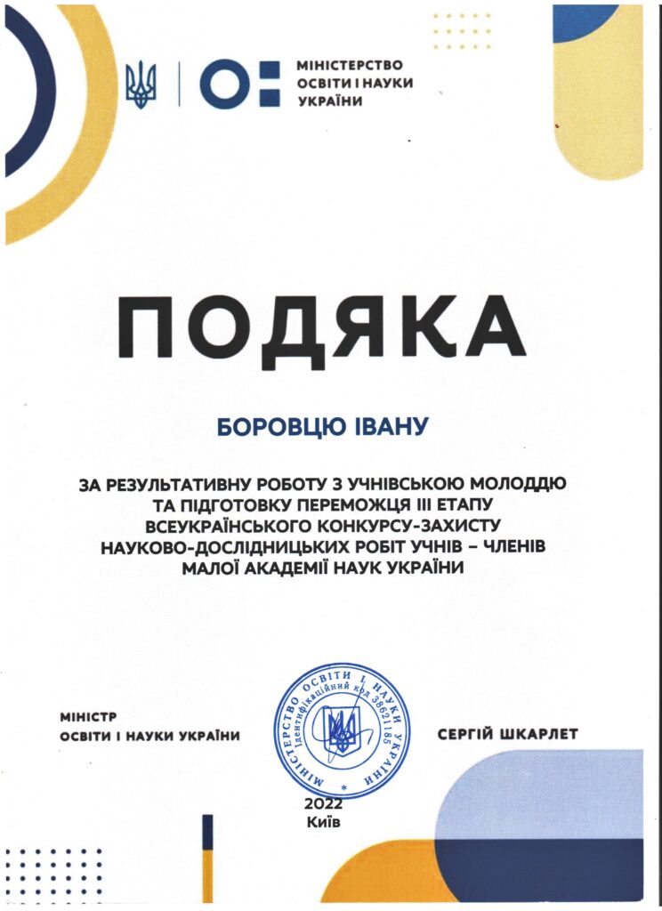 Вітаємо кандидата історичних наук, доцента кафедри всесвітньої історії Боровця Івана Івановича з отриманням подяки Міністерства освіти і науки України за результативну роботу з учнівською молоддю та підготовку переможця (ІІІ місце) ІІІ етапу Всеукраїнського конкурсу-захисту науково-дослідницьких робіт учнів-членів Малої академії наук України. У 2021-2022 н.р. І. Боровець здійснював наукове керівництво підготовкою проєкту у секції «Всесвітня історія» здобувача освіти 10 класу Кам’янець-Подільського ліцею з посиленою військово-фізичною підготовкою Вадима Лукашова на тему: «Буря в пустелі» як перший досвід новітньої блискавичної війни».