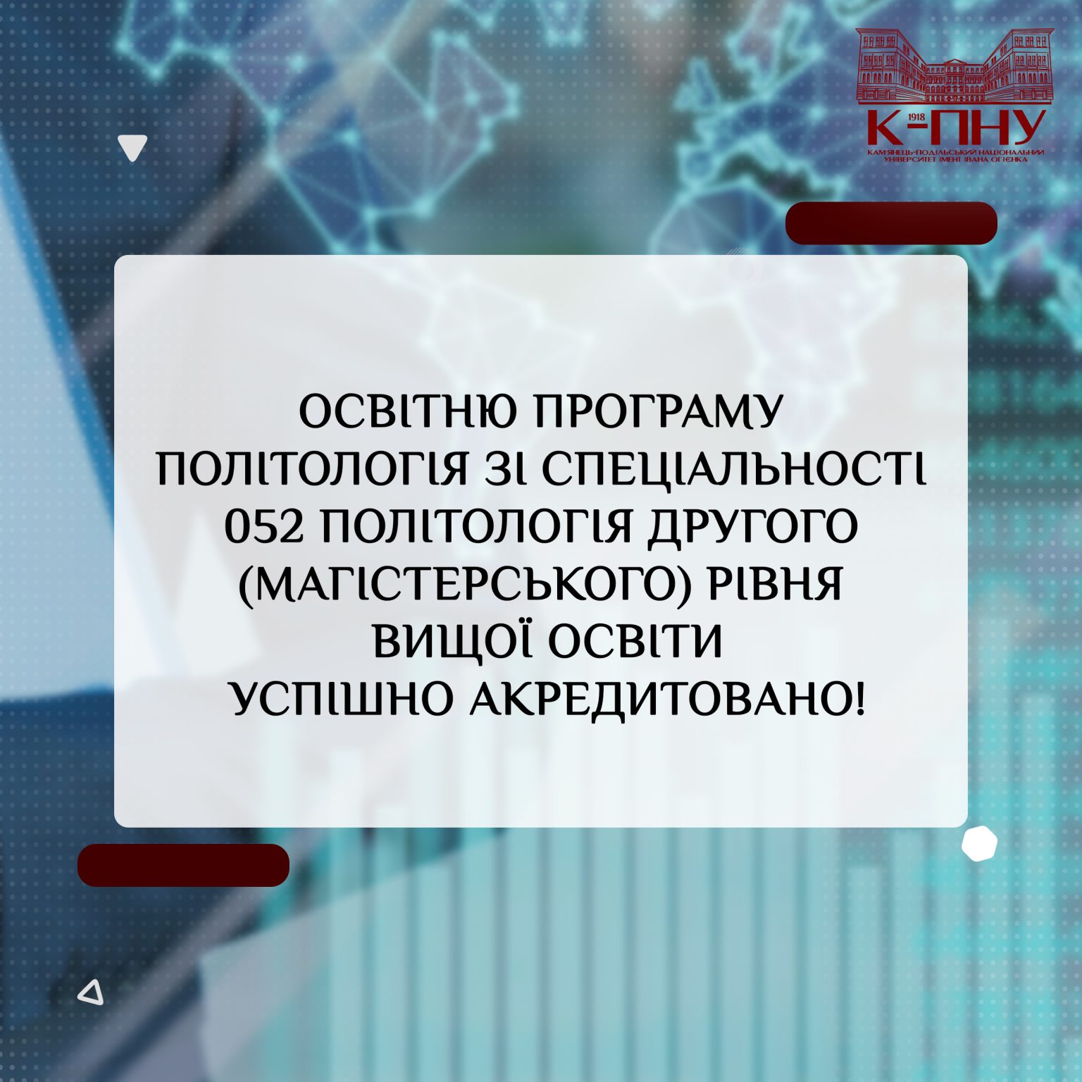 26 грудня на засіданні Національного агентства із забезпечення якості вищої освіти обговорили питання акредитаційних справ. За результатами розгляду зазначеного питання Кам’янець-Подільський національний університет імені Івана Огієнка успішно завершив процедуру акредитації освітньої програми Політологія зі спеціальності 052 Політологія другого (магістерського) рівня вищої освіти.