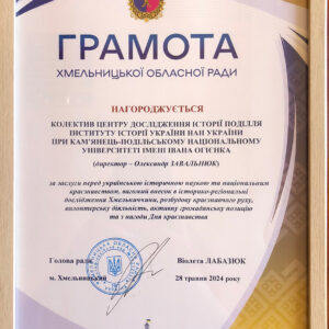 ГРАМОТА ХМЕЛЬНИЦЬКОЇ ОБЛАСНОЇ РАДИ ЦЕНТРУ ДОСЛІДЖЕННЯ ІСТОРІЇ ПОДІЛЛЯ ІНСТИТУТУ ІСТОРІЇ УКРАЇНИ НАН УКРАЇНИ ПРИ К-ПНУ ІМЕНІ ІВАНА ОГІЄНКА