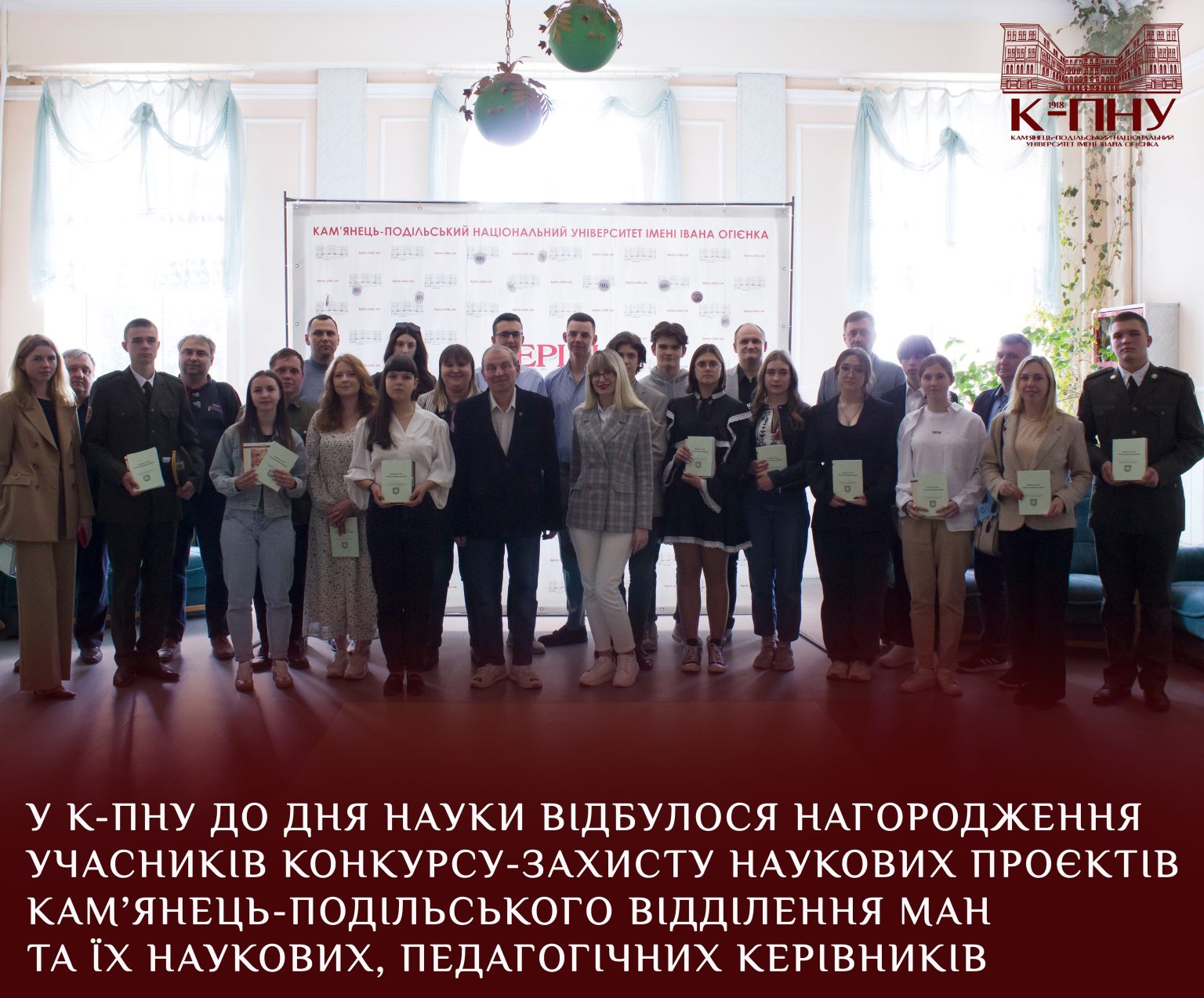 14 травня до Дня науки в К-ПНУ відбулося нагородження учасників конкурсу-захисту наукових проєктів Малої академії наук України та їх наукових/педагогічних керівників. За підсумками роботи Кам’янець-Подільського міського товариства МАН вийшов друком X випуск (ювілейний) збірника наукових матеріалів «Наукові студії учнів-старшокласників».