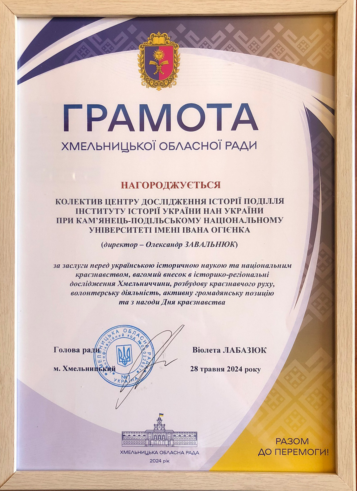 28 травня грамотою Хмельницької обласної ради нагороджено колектив Центру дослідження історії Поділля Інституту історії України НАН України при Кам’янець-Подільському національному університеті імені Івана Огієнка (керівник – доктор історичних наук, професор Олександр ЗАВАЛЬНЮК). Науковий осередок відзначено за заслуги перед українською історичною наукою та національним краєзнавством, вагомий внесок в історико-регіональні дослідження Хмельниччини, розбудову краєзнавчого руху, волонтерську діяльність, активну громадянську позицію та з нагоди Всеукраїнського дня краєзнавства.