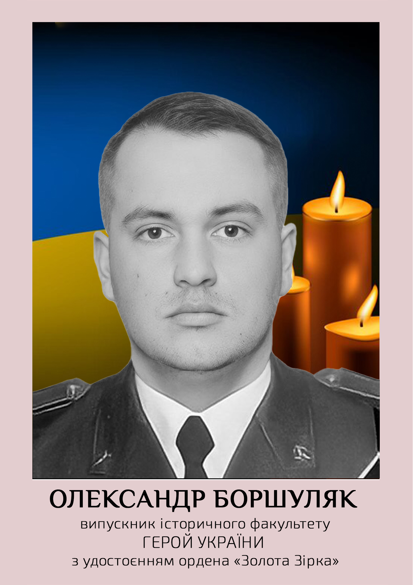 Відповідно до указу Президента України випускнику історичного факультету 2021 року спеціальності 014.03 Середня освіта (Історія та правознавство) Олександру Боршуляку (лейтенант) присвоєно звання «Герой України» з удостоєнням ордена «Золота Зірка» (посмертно) за Героїзм, мужність, виявлені у захисті державного суверенітету та територіальної цілісності України, самовіддане служіння Українському народові.