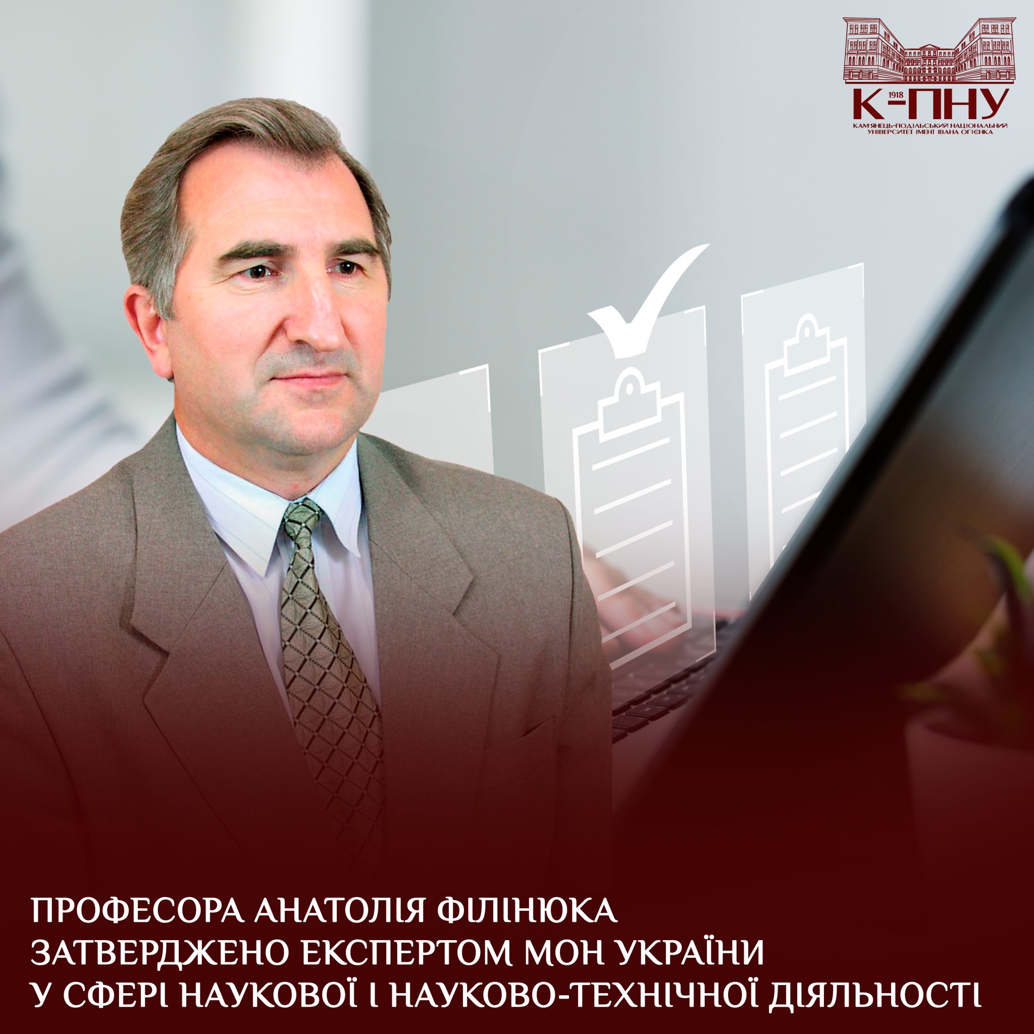 Відповідно до наказу МОН №982 від 12.07.2024 доктора історичних наук, професора, академіка Національної академії наук вищої освіти України, заслуженого діяча науки і техніки України Анатолія Філінюка затверджено експертом МОН України у сфері наукової і науково-технічної діяльності.